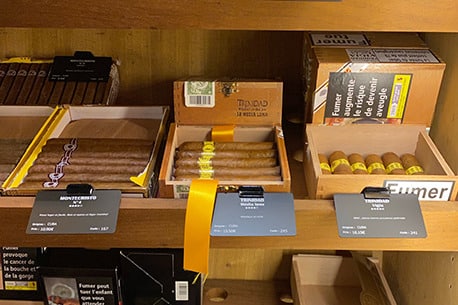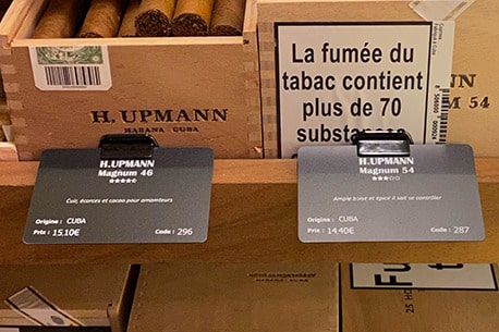 Des étiquettes de prix adaptées à la cave à cigares de la boutique « Le Cigare et la Plume »